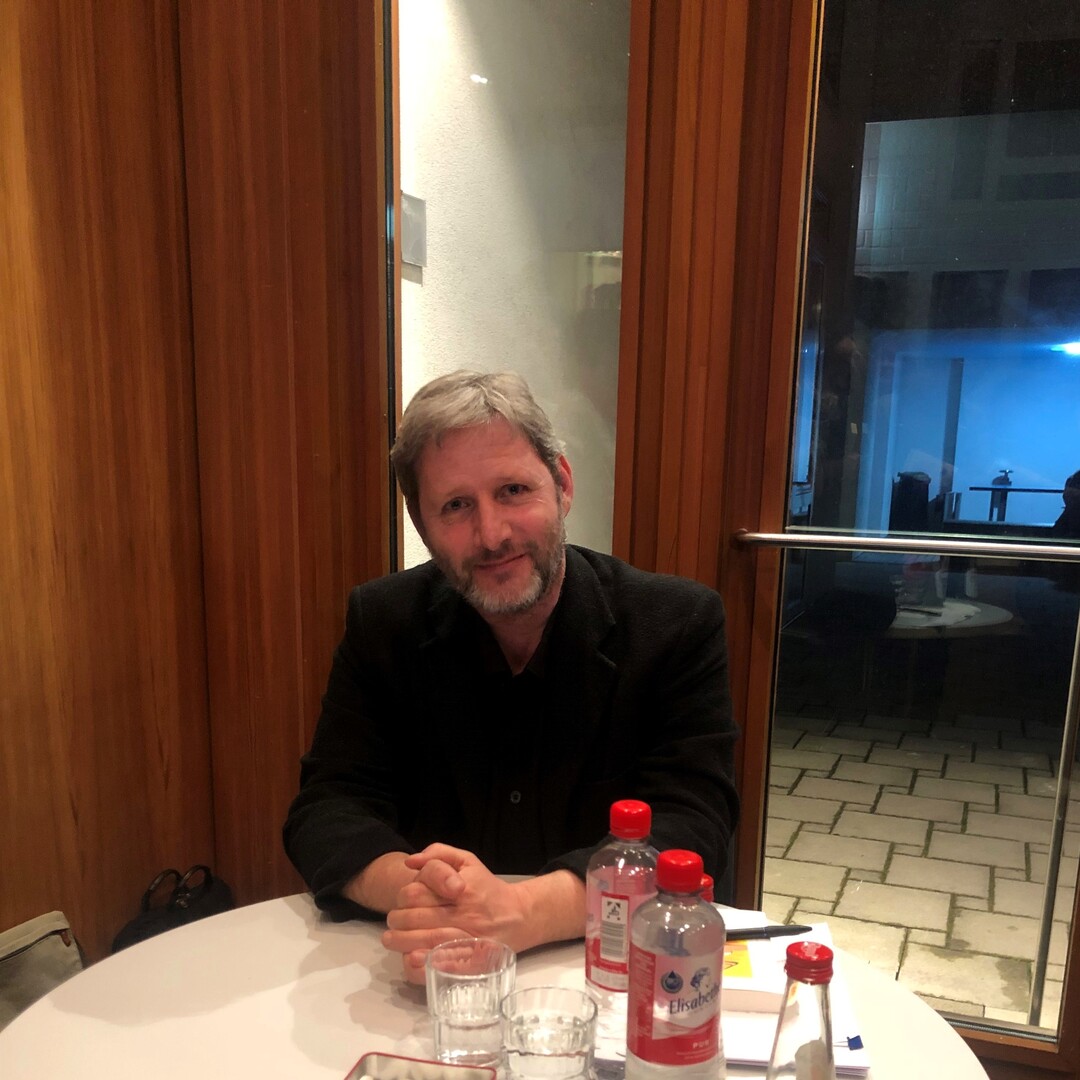 Den Abend eröffnet hat Klaus Kaltenbach, Diogenes Verlagsvertreter im Raum Hessen und mehr. Er erzählte uns ein paar kleine Anekdoten aus dem Verlagsgeschehen. Diogenes existiert nun schon seit 72 Jahren und schafft es mit seinen 50-60 Mitarbeiter:innen in Zürich, Buchhändler:innen und Leser:innen in ganz Deutschland mit besonderen Geschichten zu begeistern. Die Lesung läutete er mit einer kleinen Hintergrundgeschichte ein, die erzählte, wie Emanuel Bergmann und somit auch Tahara überhaupt zu Diogenes gekommen sind.